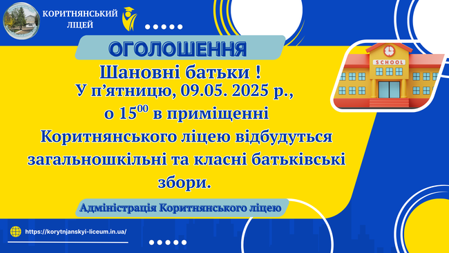 У п’ятницю 09.05.2025 р. відбудуться загальношкільні та класні батьківські збори. Початок о 15:00