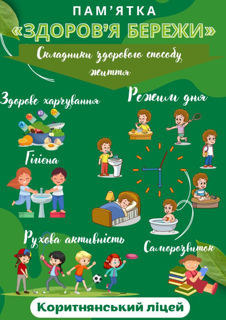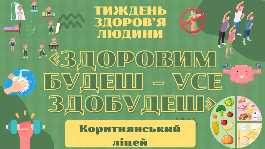 Із 31 березня по 4 квітня у Коритнянському ліцеї було проведено тиждень здоров’я людини. Головна мета тижня здоров’я – підвищити обізнаність учнів про важливість здорового способу життя, сформувати в них відповідальне ставлення до власного здоров’я та заохотити до ведення здорового способу життя.