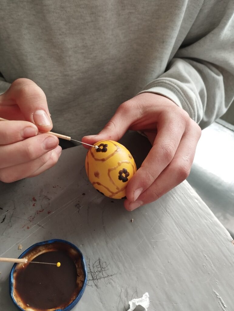 Учасники опанували нову техніку розпису великодніх писанок – шпилькову техніку воскового розпису. За допомогою шпильки, прикріпленої до дерев’яної палички, яку вмочують у розплавлений віск , наносили прості візерунки. Орнамент переважно складався з простих елементів: крапок і крапель, поєднання яких утворило нескладні форми квітів, сонця, хрестиків та птахів. Для зафарбовування яєць використовували переважно світлі та яскраві кольори: жовтий, зелений, блакитний, червоний, помаранчевий.