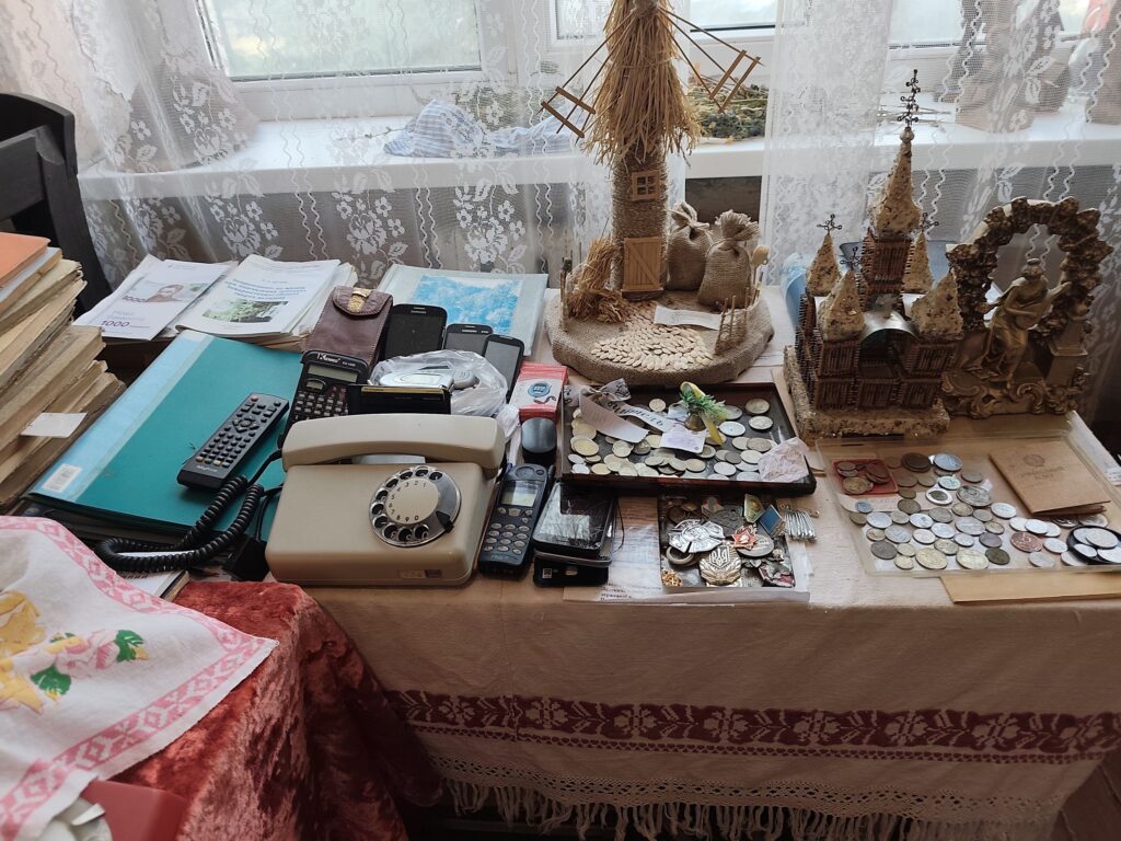 це одяг, рушники, предмети повсякденного вжитку: шкатулки, праска, керосинова лампа, млинки, дзеркало, лада, ліжко, стіл із стільцями, піч, чорнильниця і перо, посуд і т. д.