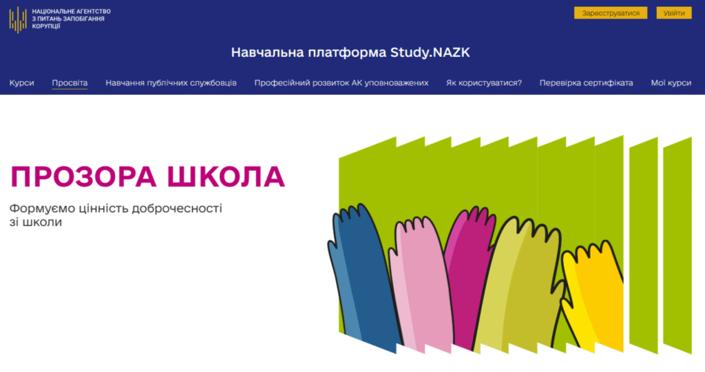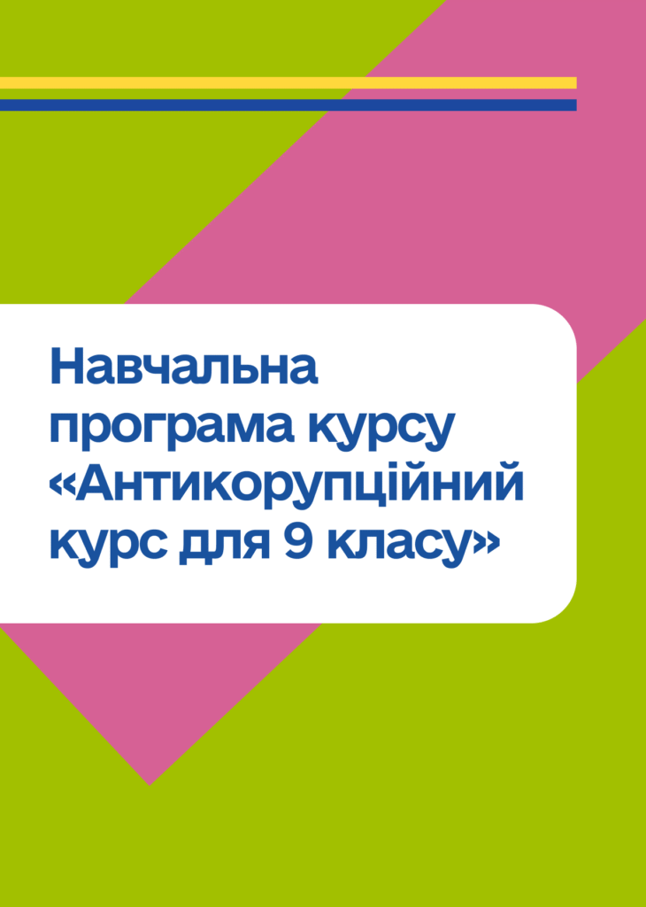 - Антикорупційний курс для 9 класу — навчальна програма на 15 годин, яку можна інтегрувати у предмет “Основи правознавства”, та навчально-методичний посібник для реалізації цієї програми. Посібник містить кейси, проєктні завдання, дебати, практикуми та сторітелінг. Теми охоплюють поняття доброчесності, природу та наслідки корупції, роботу антикорупційних органів, конфлікт інтересів і академічну доброчесність.