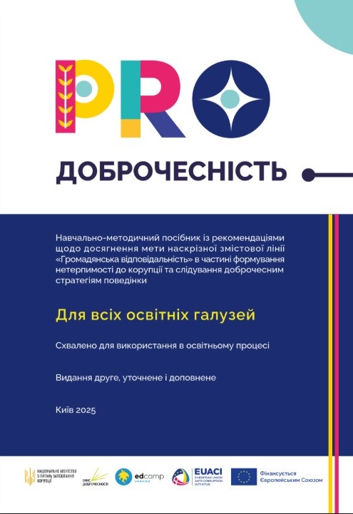 - Посібник “PROдоброчесність” — 110 вправ для вчителів 5–11 класів з усіх дев’яти освітніх галузей. Матеріали містять інструкції з покроковим алгоритмом, приклади з життя, ілюстрації та QR-коди для доступу до ресурсів.