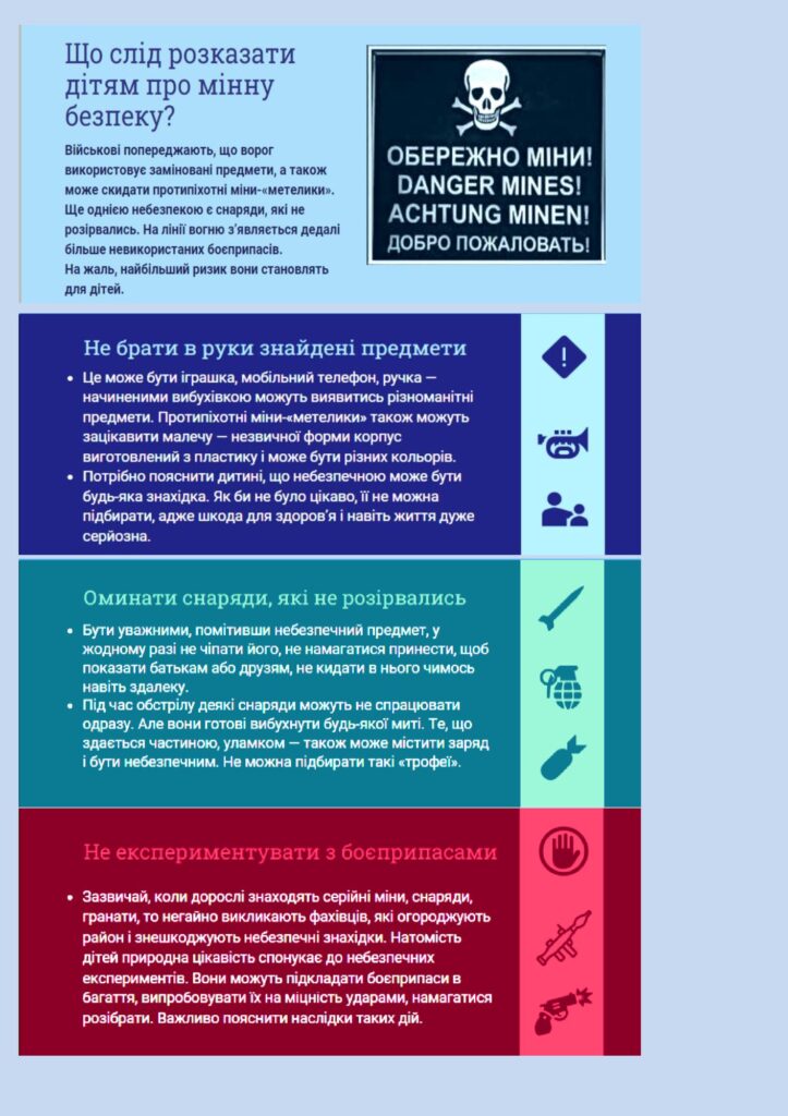 Безпека дітей є основним пріоритетом у будь-якому навчальному закладі. Особливо важливою в наш час є мінна безпека – навчання дітей правил безпечної поведінки при виявленні вибухонебезпечних предметів.