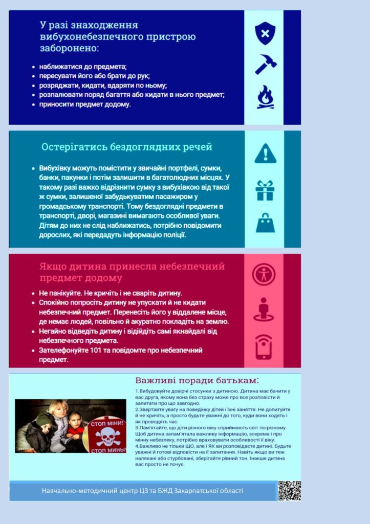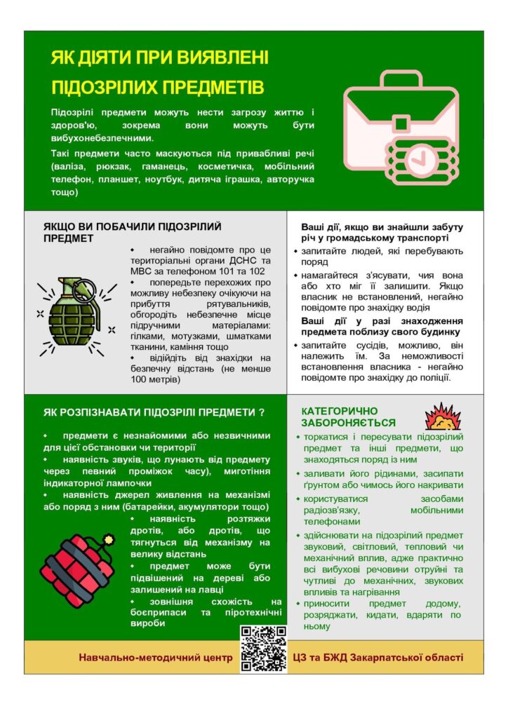 Виявивши вибухонебезпечні предмети, вживайте заходів з їх означення, огородження і охороні знайдених предметів на місці виявлення. Негайно повідомте про це територіальні органи ДСНС та МВС за телефоном “101” та “102”.