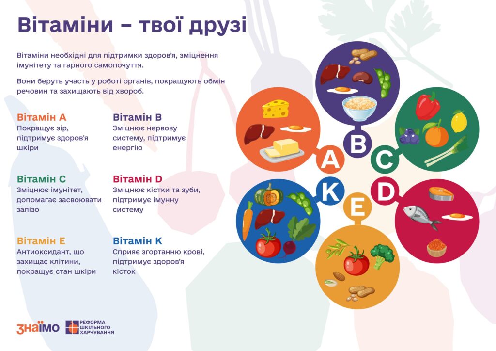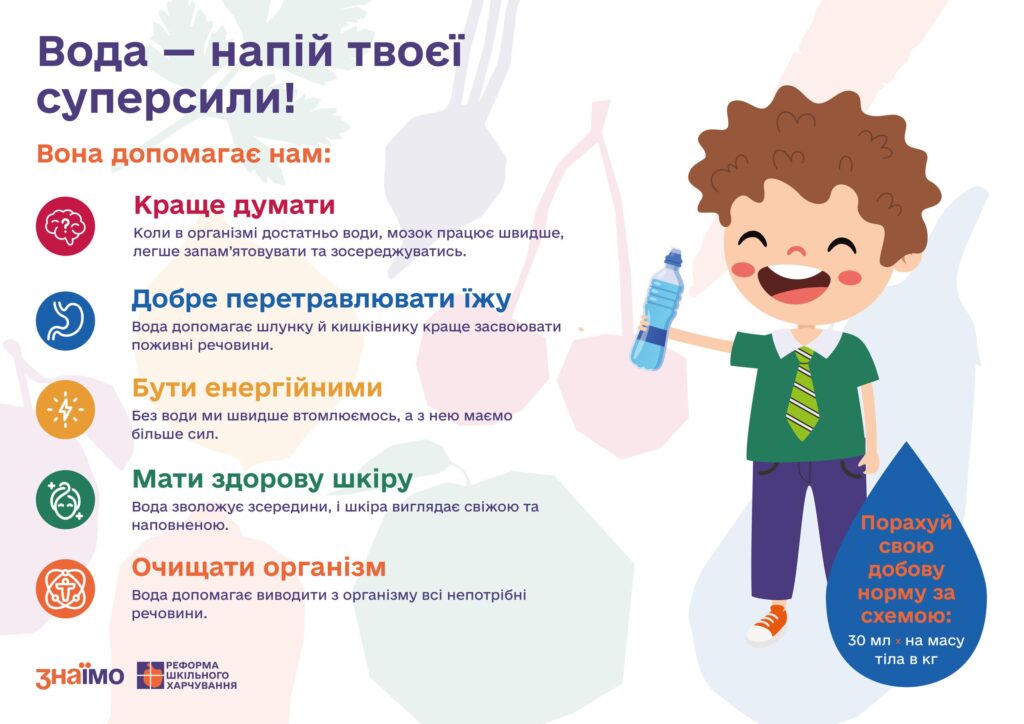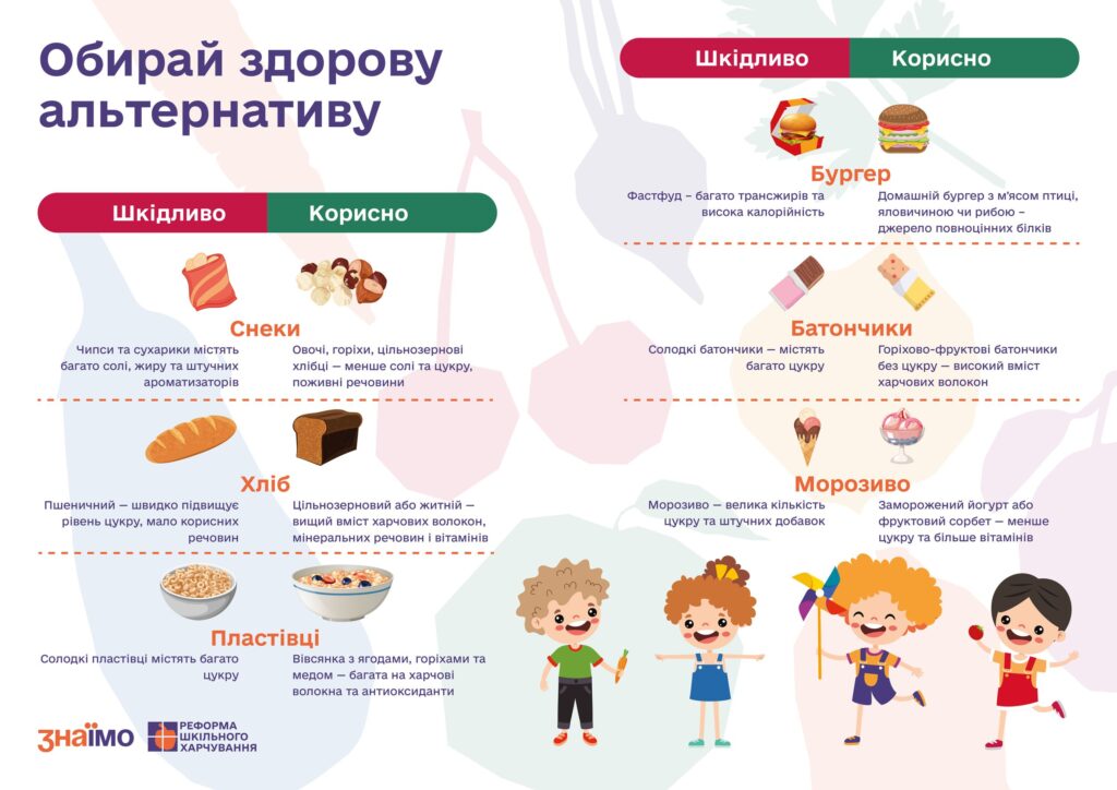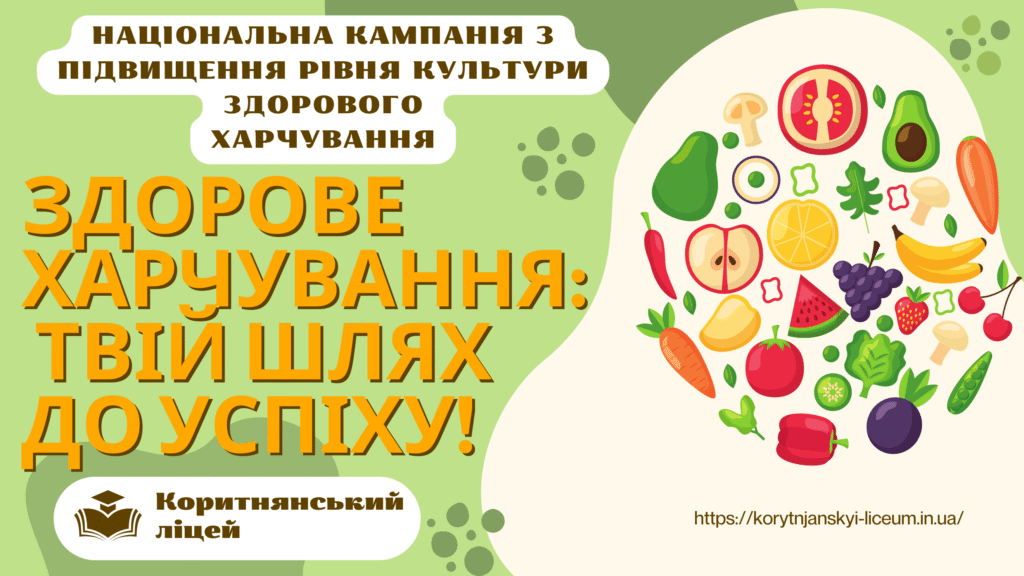 Шановні учні та батьки! В рамках національної кампанії з підвищення рівня культури здорового харчування у закладі освіти (лист МОН України “Щодо кампанії з підвищення рівня культури здорового харчування” №1/16410-25 від 06.08.2025 р.) рекомендуємо ознайомитись з  інформаційними банерами.   Ці візуальні підказки розроблені, щоб допомогти кожному зробити правильний вибір корисної їжі. Мета кампанії — формувати у дітей звичку свідомо обирати продукти як у школі, так і вдома. Завдяки яскравому та цікавому дизайну банери просто і доступно пояснюють складні теми. Зокрема, вони розповідають про важливість вітамінів та де їх можна знайти. Ви дізнаєтесь про щоденну норму споживання води та ідеї корисних напоїв. Також банери висвітлюють питання балансу солі та цукру в раціоні. І, нарешті, ви знайдете корисні альтернативи для заміни нездорових продуктів.