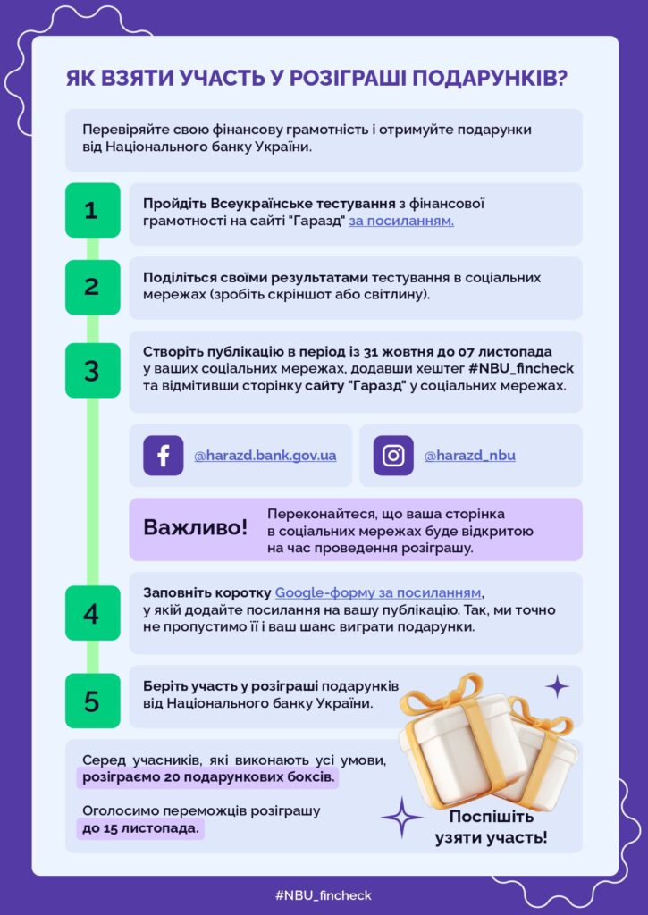 Серед учасників, які виконають усі умови, розіграють 20 подарункових боксів. Оголошення переможців відбудеться 15 листопада.