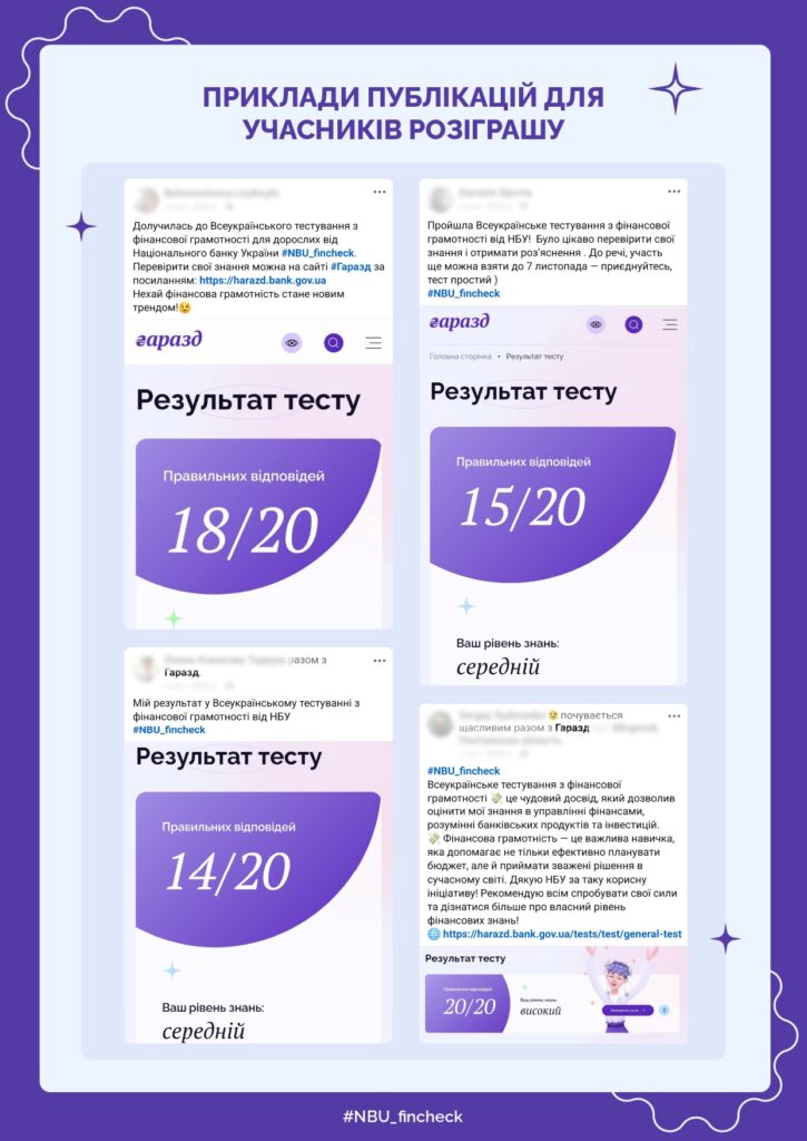 У межах тестування учасники матимуть можливість перевірити свої знання, відповівши на 20 запитань, кожне з яких відображає реальні ситуації, з якими часто стикаються споживачі фінансових послуг.
