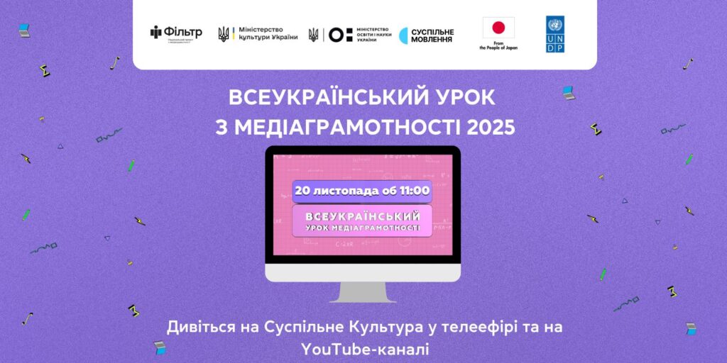 Всеукраїнський урок з медіаграмотності реалізовує Фільтр. Національний проєкт з медіаграмотності Міністерство культури України та Суспільне Мовлення за підтримки UNDP Ukraine / ПРООН в Україні та фінансування уряду Японії Посольство Японії в Україні / 在ウクライナ日本国大使館 / Embassy of Japan in Ukraine.