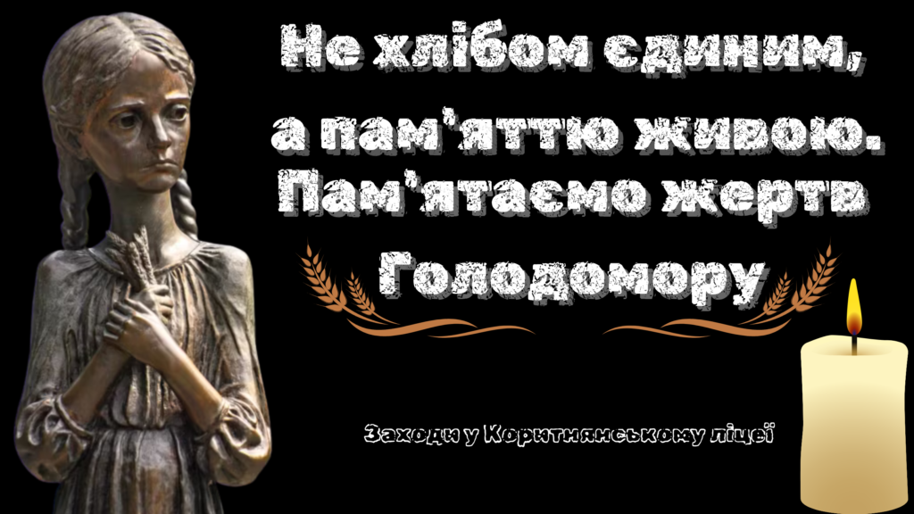 Щороку в четверту суботу листопада Україна вшановує пам’ять жертв Голодомору 1932–1933 років і масових штучних голодів 1921–1923 і 1946–1947 років. Напередодні цього пам’ятного дня у Коритнянському ліцеї відбулися тематичні заходи. А саме: