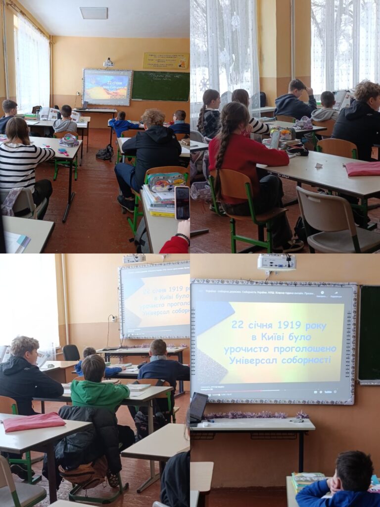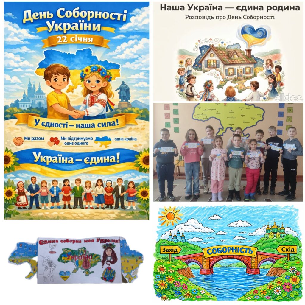 • Виховні години та бесіди за темами: «Символи соборності: від минулого до сьогодення» (5 кл.), «Моя Україна – соборна держава» (6 кл.), «Разом сильніші: День Соборності України» (9-Б кл.), «День Соборності України – сила єдності» (ГПД), «Сила в єдності» (2 кл.), «Суверенна моя Україна» (11 кл.);