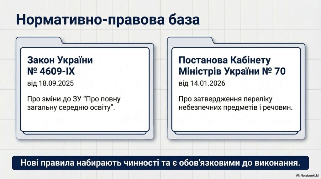 - Закон України № 4609-IX від 18.09.2025 «Про внесення змін до Закону України “Про повну загальну середню освіту” щодо запровадження заходів безпеки в закладах загальної середньої освіти»;