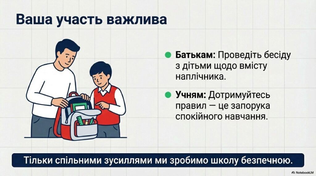 Ми просимо батьків стати нашими союзниками: будь ласка, переглядайте вміст наплічників молодших школярів та проводьте довірливі бесіди зі старшокласниками про важливість цих обмежень. Кожна вилучена небезпечна річ — це відвернута загроза. Пам’ятайте, що ліцей — це територія безпеки, де немає місця страху чи ризику.