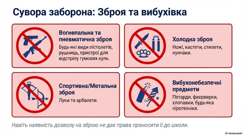 - Припинення доступу: Учень, який має при собі заборонений предмет, не допускається до навчальних занять до моменту усунення порушення (передачі предмета батькам або вилучення у встановленому порядку).