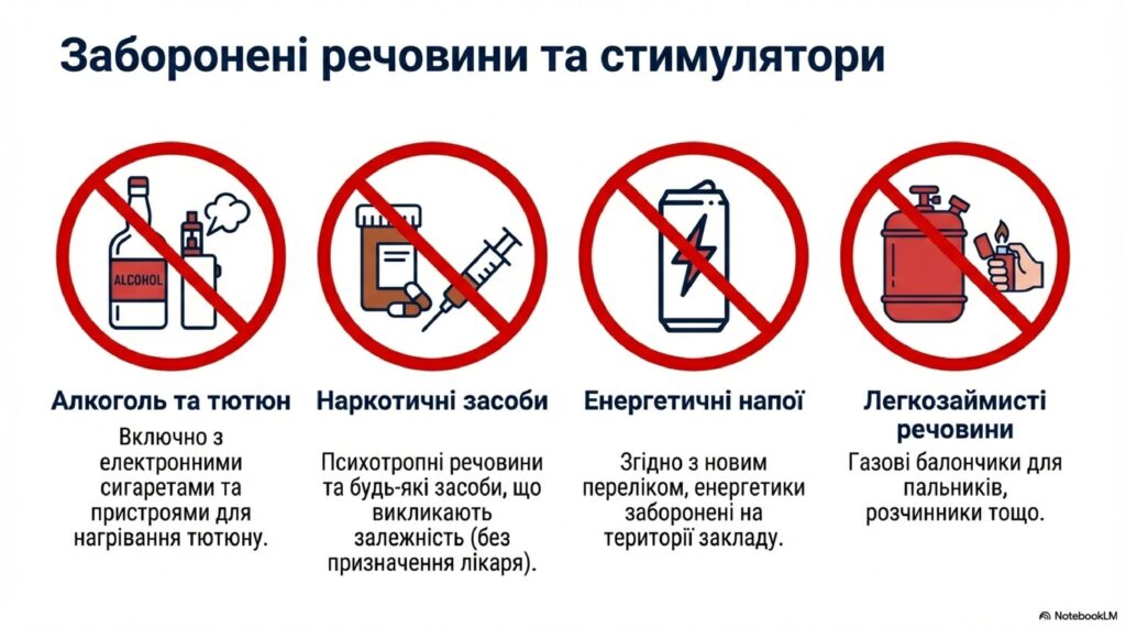 - Заборона сп’яніння: Категорично заборонено перебування у ліцеї осіб з явними ознаками алкогольного, наркотичного або іншого сп’яніння.