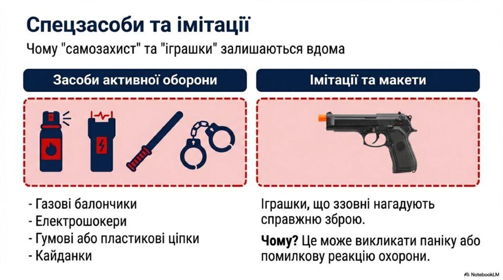 - Газові балончики, електрошокери, пристрої для відстрілу гумових куль.