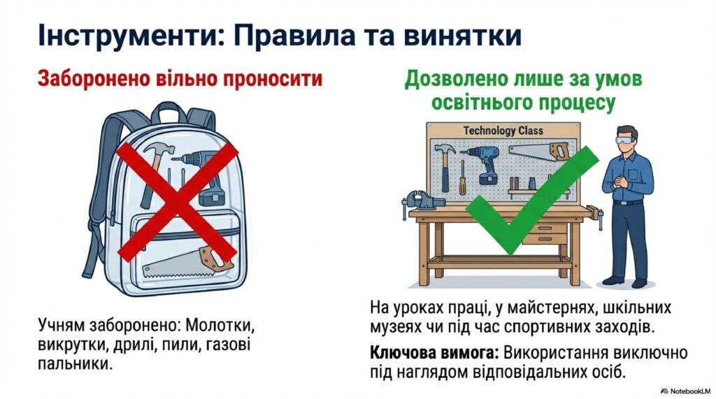 Важливо: Такі предмети можуть використовуватися учнями виключно під безпосереднім контролем відповідальних вчителів або майстрів і, як правило, забезпечуються самим закладом освіти або приносяться за попереднім узгодженням.
