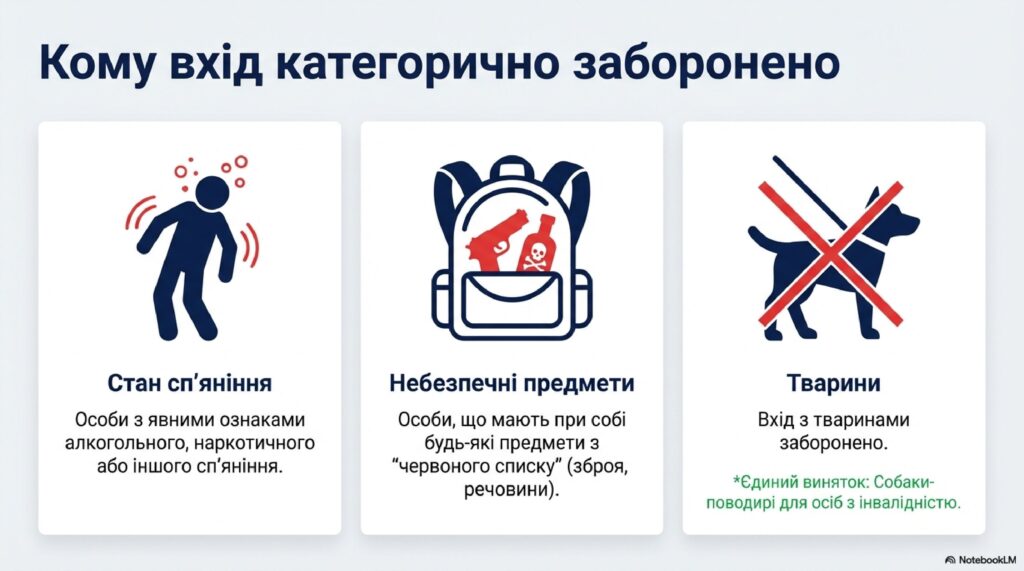- Тварини: Перебування з тваринами на території закладу заборонено. Виняток становлять лише собаки-поводирі, які супроводжують осіб з інвалідністю.