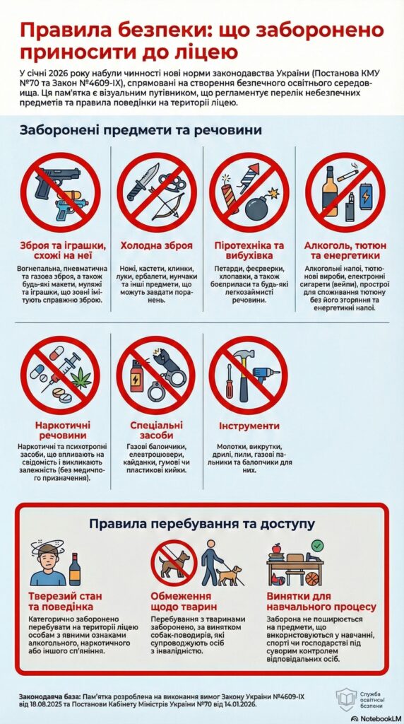 Шановні батьки та учні! Забезпечення безпечного освітнього середовища є ключовим завданням Міністерства освіти і науки України та адміністрації нашого ліцею. Ця пам’ятка розроблена на виконання нових державних стандартів безпеки з метою захисту життя та здоров’я кожної дитини. Ми закликаємо вас до відповідальної співпраці, адже чітке дотримання встановлених правил дозволяє створити простір, де навчання є продуктивним, а перебування — захищеним.
