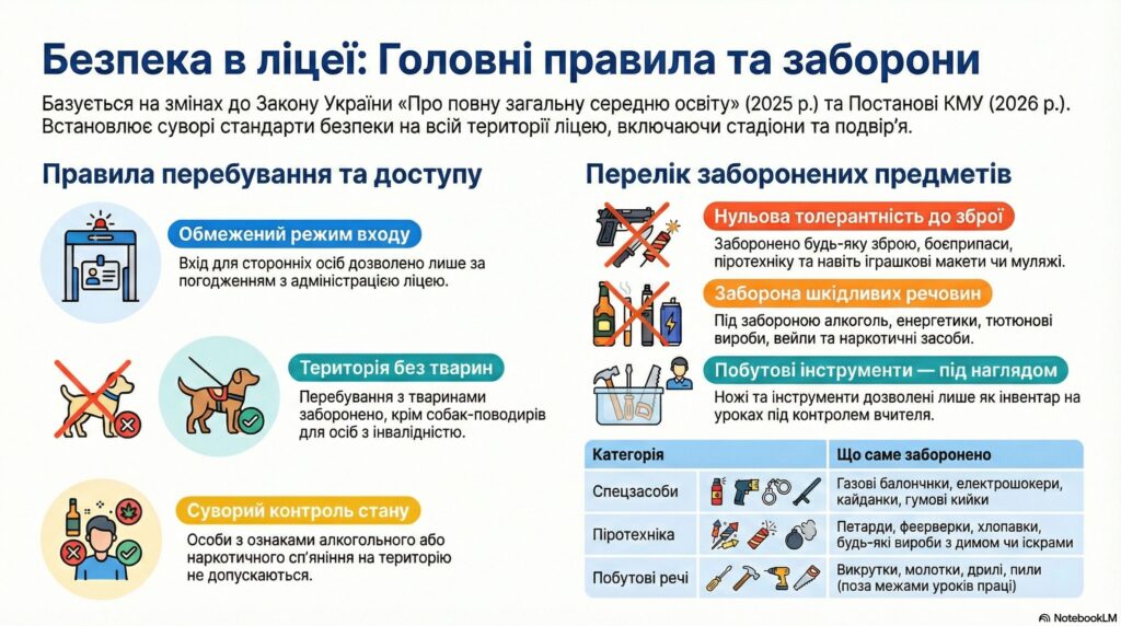 У разі виявлення заборонених предметів або порушення правил доступу, ліцей діє відповідно до норм Статті 41-1 Закону України задля захисту всіх учасників процесу: