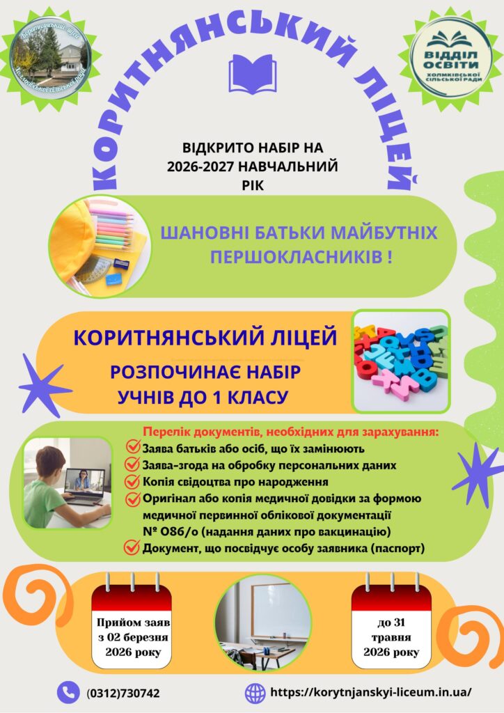 Про зарахування дітей до 1-го класу Коритнянського ліцею Холмківської сільської ради на 2026/2027 навчальний рік